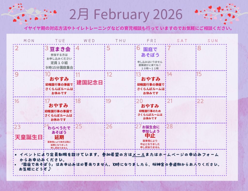 園事情により、2月の活動内容が変更となりました。ご迷惑をお掛けして大変申し訳ありません。延期となったイベントの日程は後日お知らせ致します。
