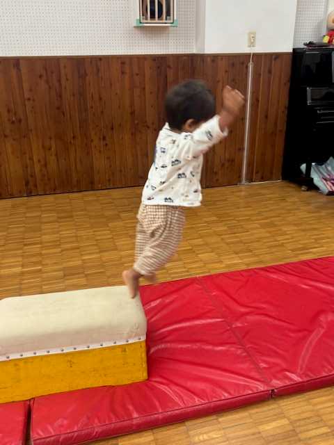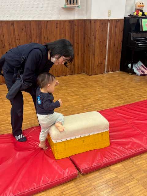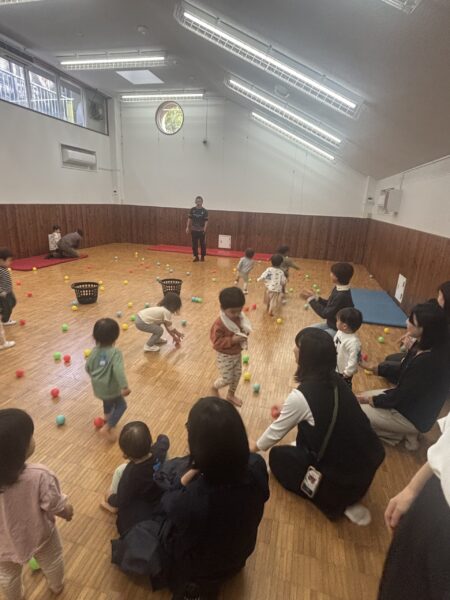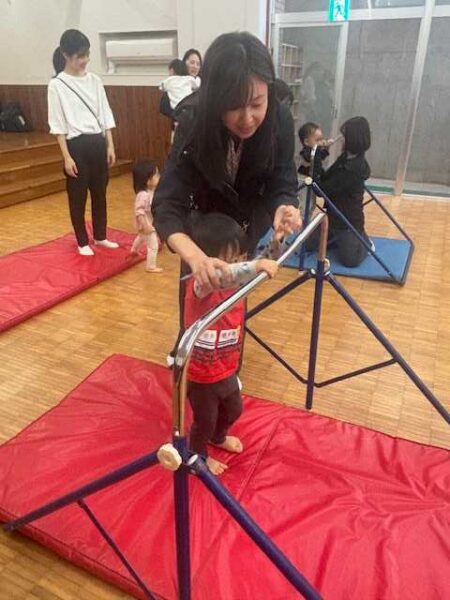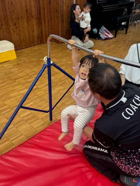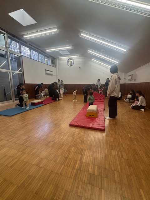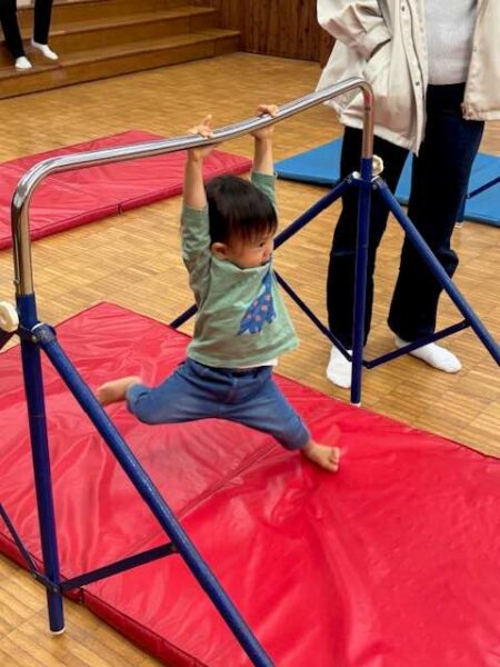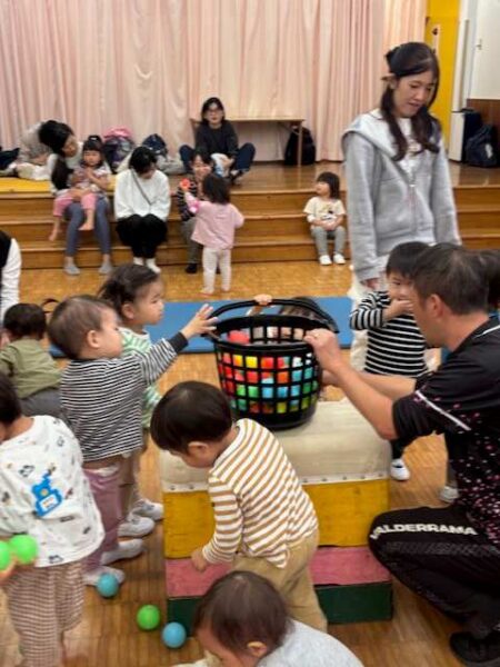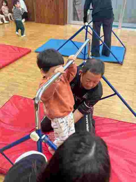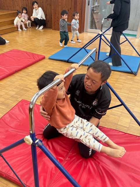 10月28日(火)さくら幼稚園の地下ホールで保育室の1歳児クラスのお友だちといっしょにさくらんぼルームの親子が「からだであそぼう」に参加しました。鉄棒やマット運動・玉入れごっこを通してまさお先生が体を使った楽しい遊びをたくさん教えてくれました!