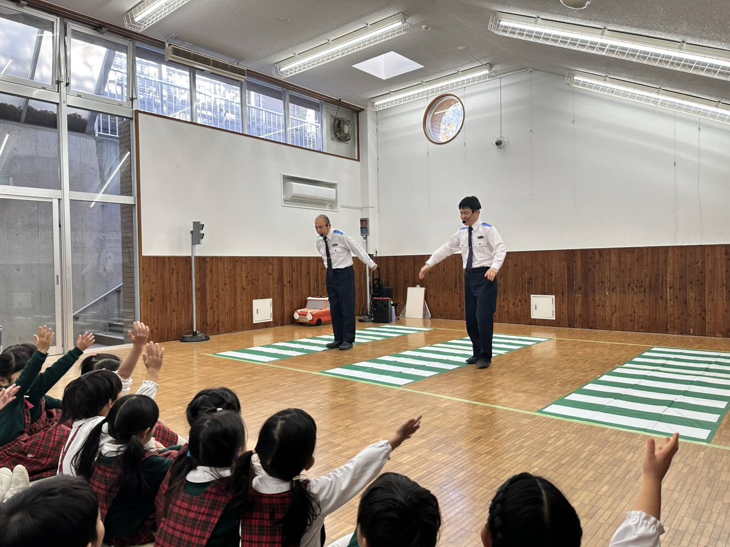 交通安全教室に参加しました。ゲームを通して交通ルールを学び、みんなで横断歩道を渡り方を練習しました。命の大切さや交通ルールを守ることの大切さを感じる一日でした。