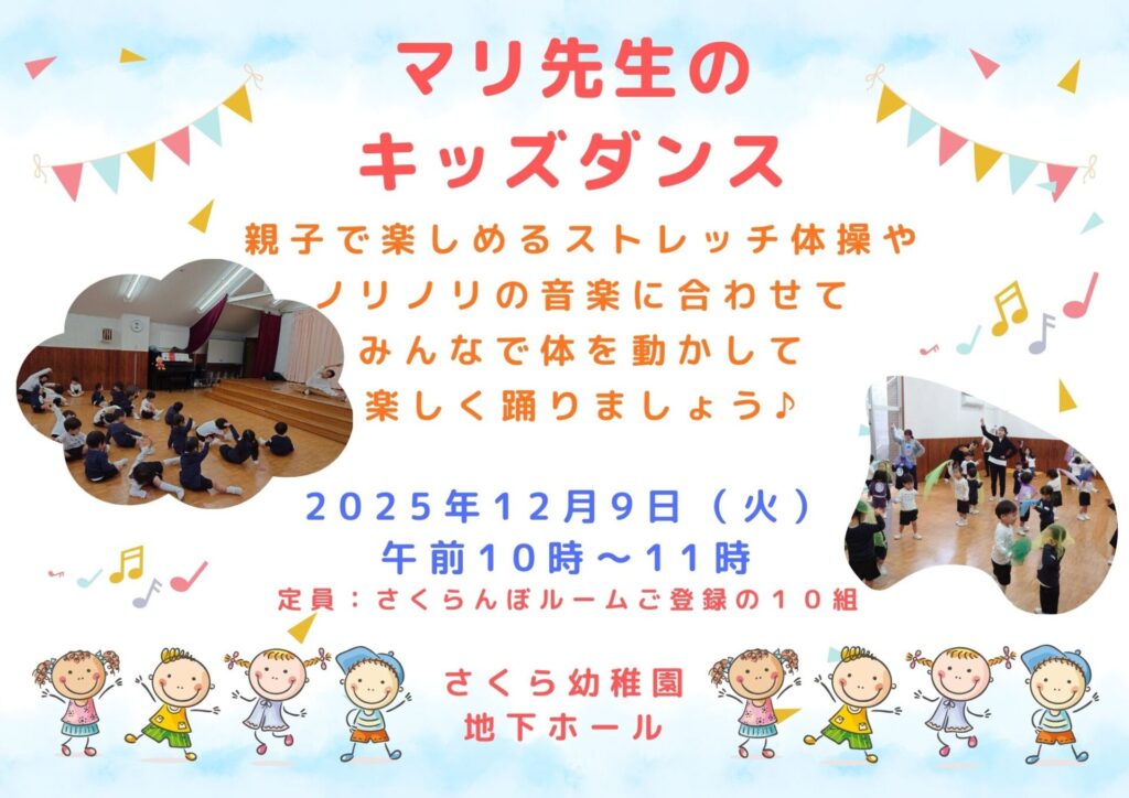 飯島まり先生は、さくら幼稚園の在園児や学童クラブの子どもたちにもいつもクールなダンスを教えて下さっています。先日は教え子たちが久富稲荷神社で、ダンスパフォーマンスのイベントにも参加しましたよ!尚、キッズ向けのダンスなので、未就園児クラスのすみれ組さんが一緒に参加します。ベビトレヨガを取り入れた準備体操も行いますので、歩行がまだのお子様も抱っこやねんねで参加できます。ママ・パパたちもリフレッシュできますので奮ってご参加くださいね♪