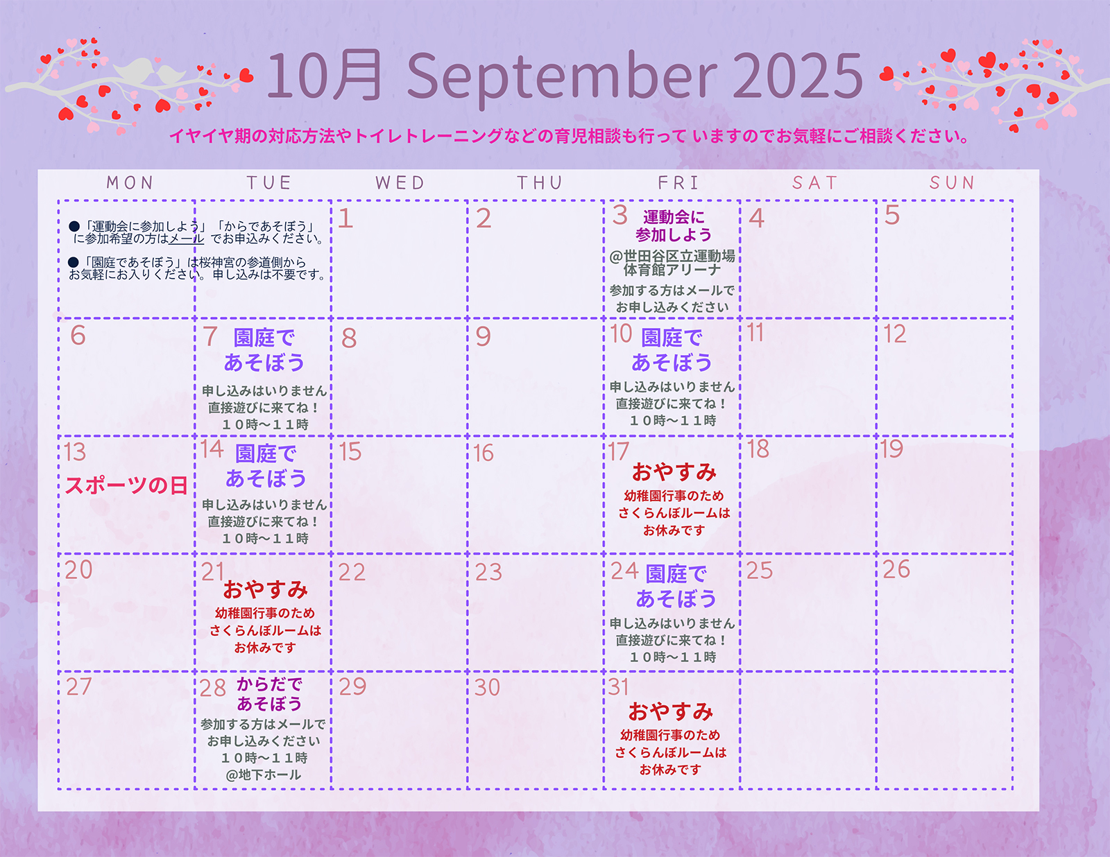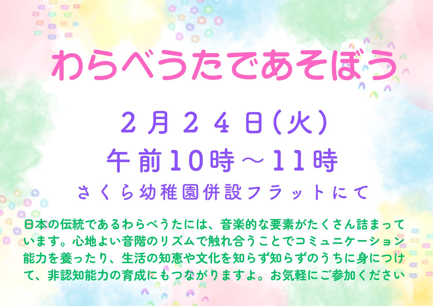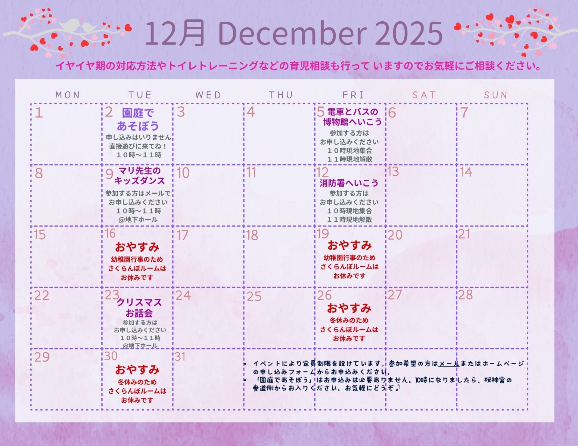 毎週火曜と金曜の午前中には、さくら幼稚園や保育室「さくらキッズ」、併設施設「フラット」などで親子のための楽しいイベントや遊びの紹介を行っています。